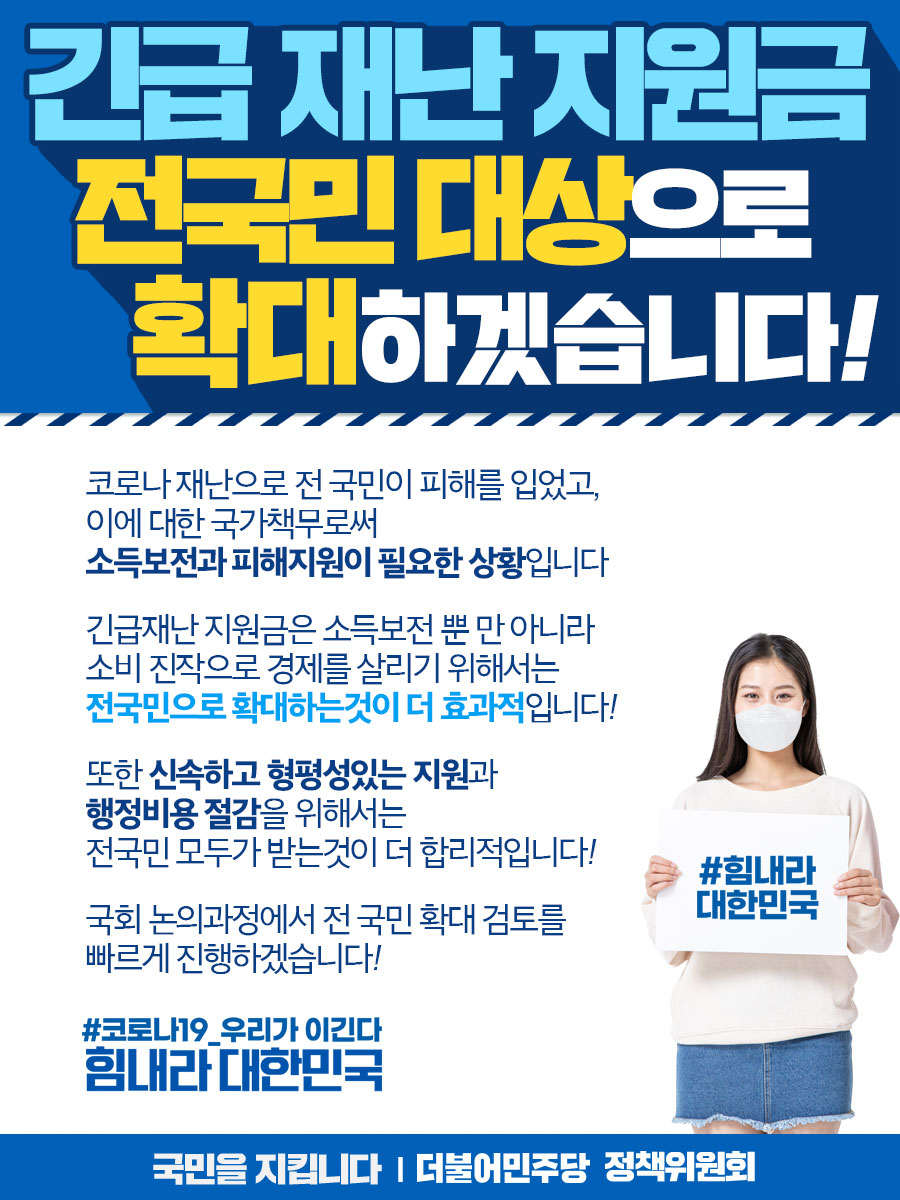 국민재난지원금 - Aznw0y4h1r2p8m / 포용적 완화 정책 그리고 전 국민 재난지원을 포함하는 추가 경정 예산안의 편성과 처리가 시급하다.] 시기는 추석 전을 목표로 하고 있습니다.